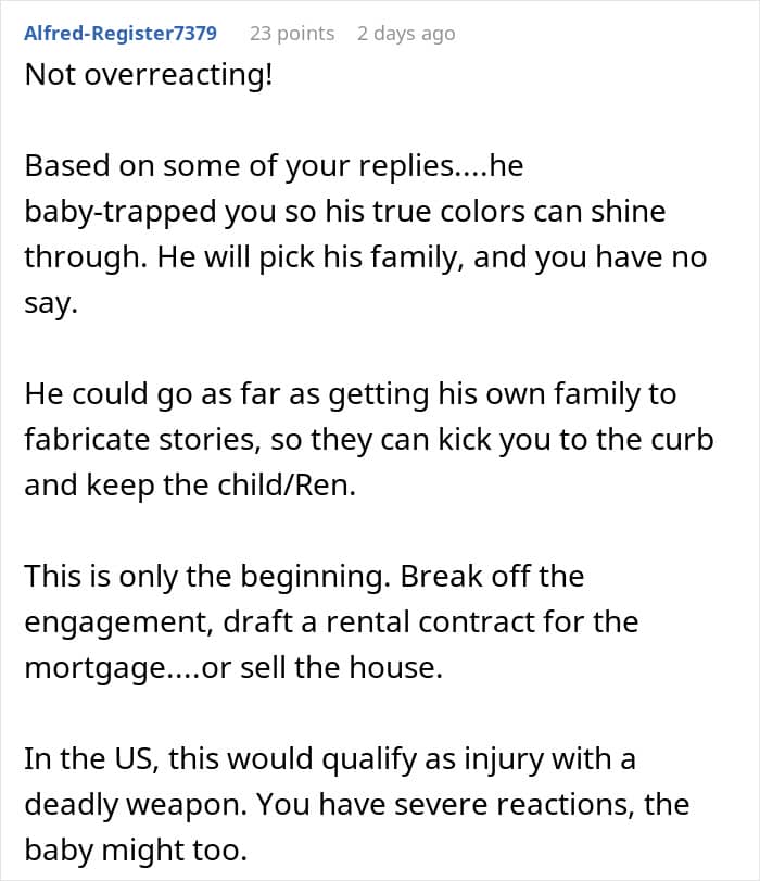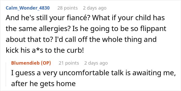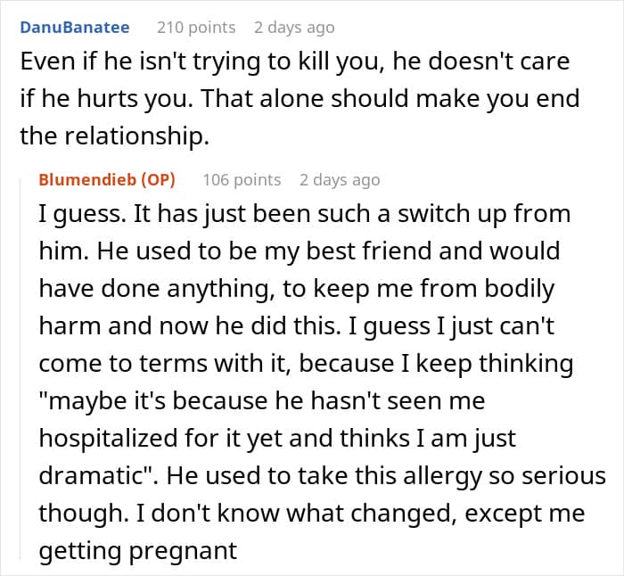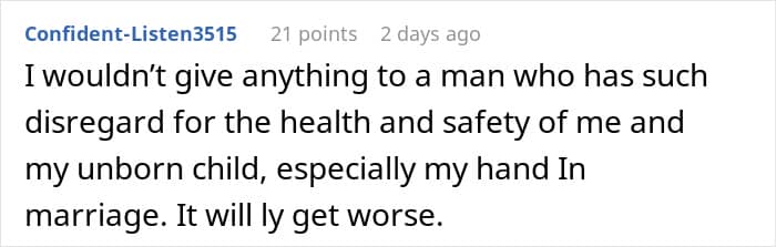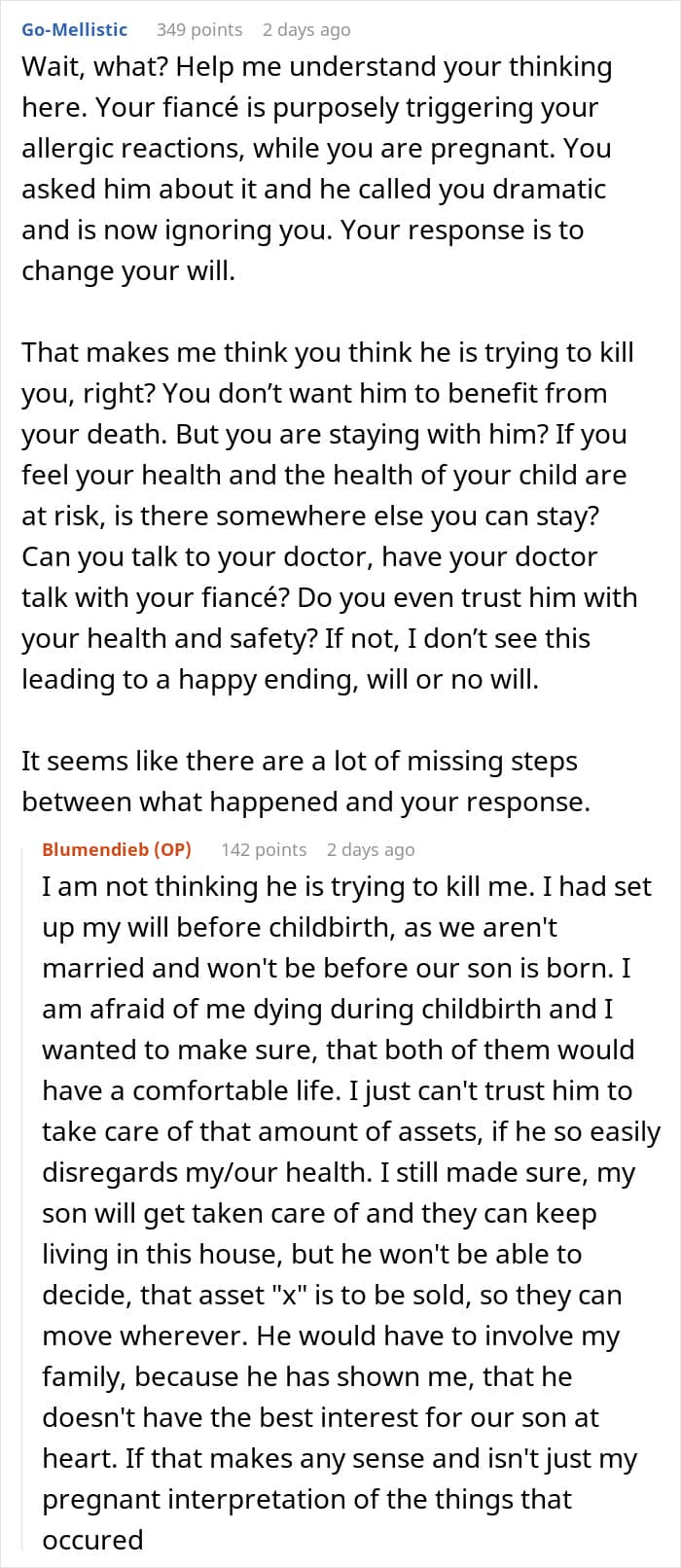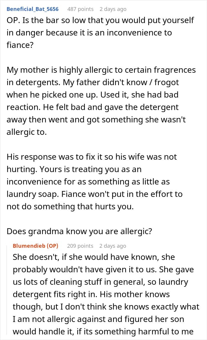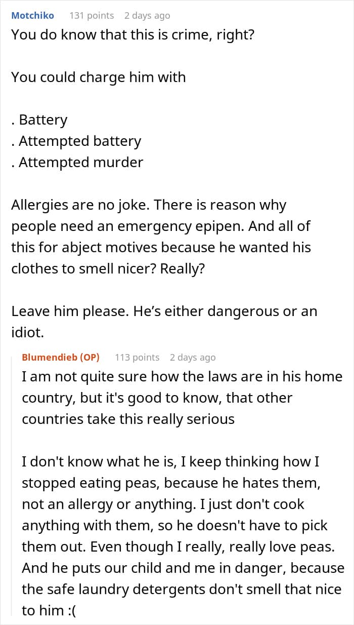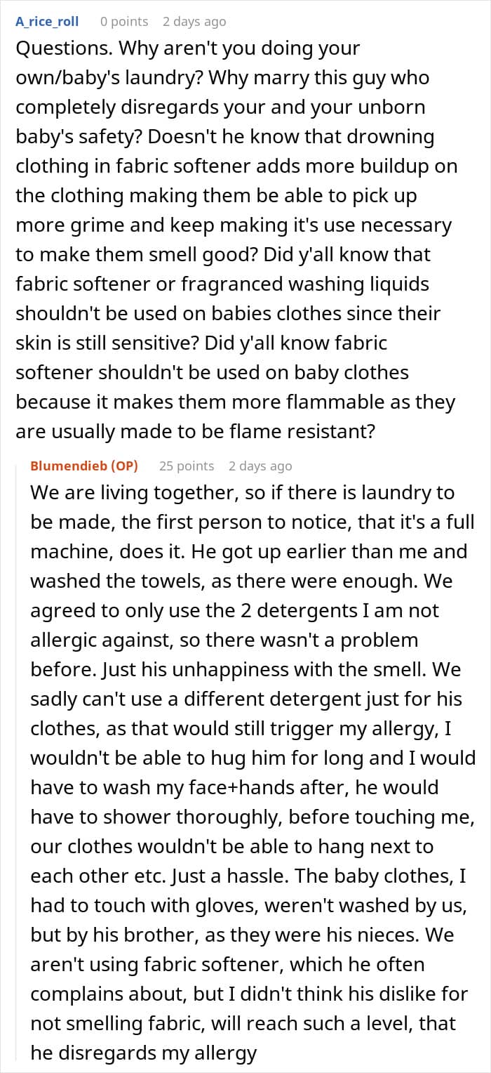 Redditor Blumendieb found it difficult to get through this to her fiancé. He kept complaining that the detergent they use, which is safe for her, doesn’t make their clothes smell good. So he decided to wash their laundry with it anyway, which not only endangered her but also their unborn son.
