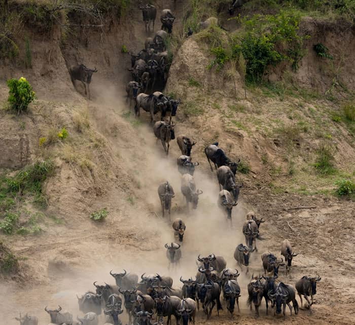 Not me, but a close family friend. They were on a safari in Africa, my friends younger brother was trapped in a gorge. His father ran down and safely got him up to higher ground but was trampled by a herd of wildebeests in the process.