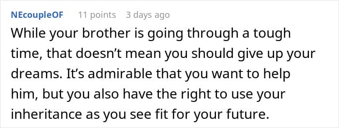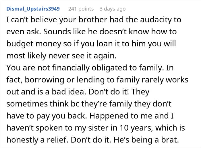 Furthermore, why is it just the older brother’s duty to help his younger sibling out? If the debt situation is so awful, surely, more family members would be interested in lending a hand? Though it’s hard to judge a situation from afar, it feels like there’s a lot of opportunism at play here.