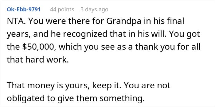 The core issue here is the question of what’s fair. On the one hand, we have the author who put in consistent effort taking care of his grandfather because he loved him, wanted to spend time with him, and wanted to improve the quality of his life. His grandad rewarded him with $50,000, a very generous sum of money.