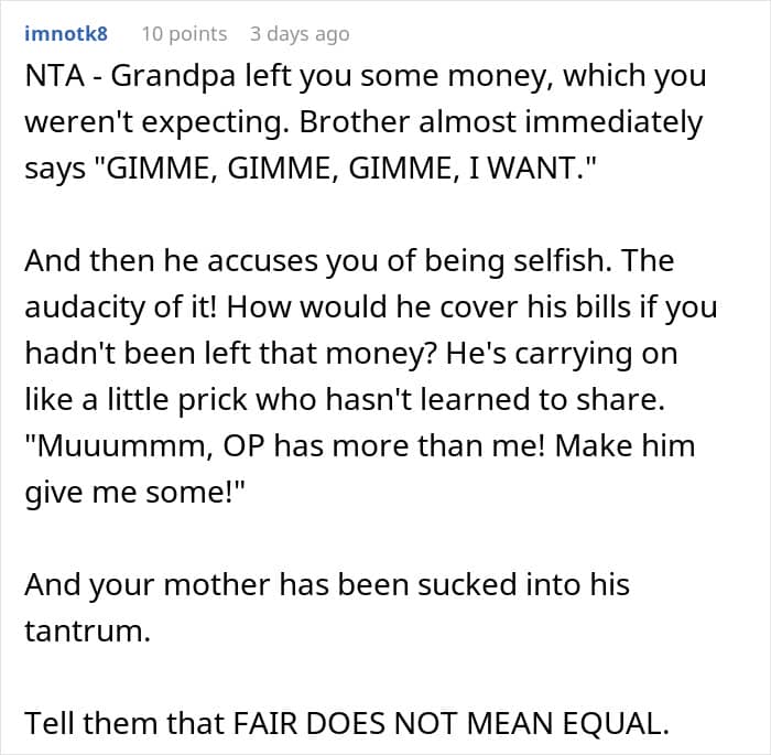 A man who received a sizeable amount of money from his grandfather asked for advice after his desperate sibling suddenly demanded most of the cash