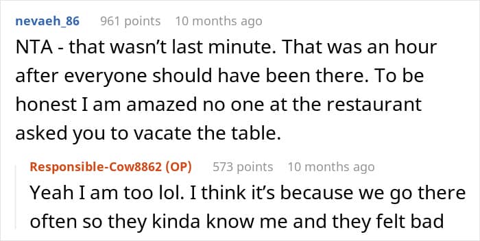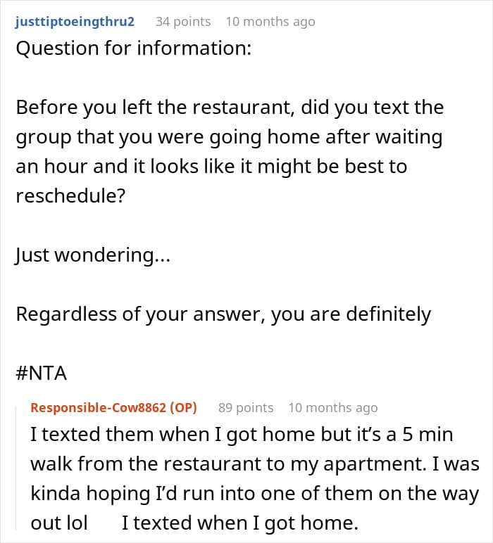 A mature person would give the benefit of the doubt, which the author did. She accepted everyone’s justifications without question and waited an hour before leaving the restaurant.