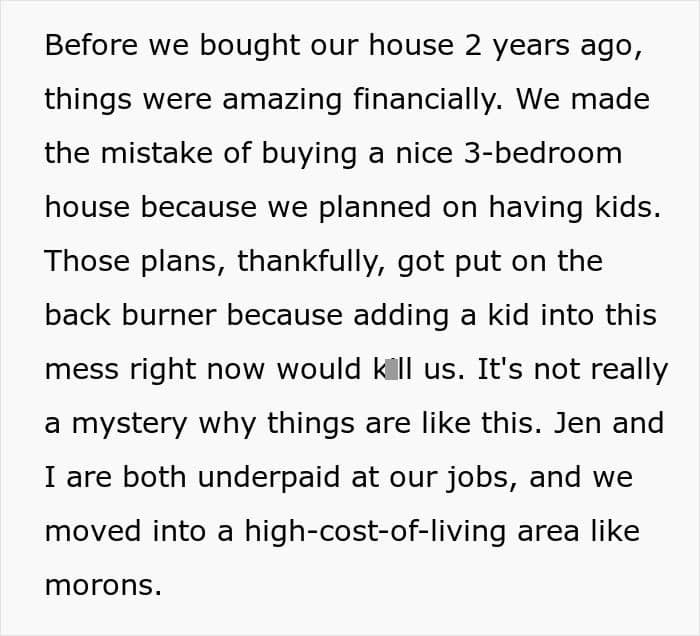However, for an American couple, purchasing a 3-bedroom house in an expensive neighborhood turned out to be a costly mistake. A man took to Reddit to share how he and his wife started having financial troubles right after they moved into their new place. According to him, they had two choices: either sell the newly bought home or increase their income. While he got a new job, his wife was reluctant about getting one. Read on to discover why the author considered divorce as an option.