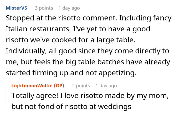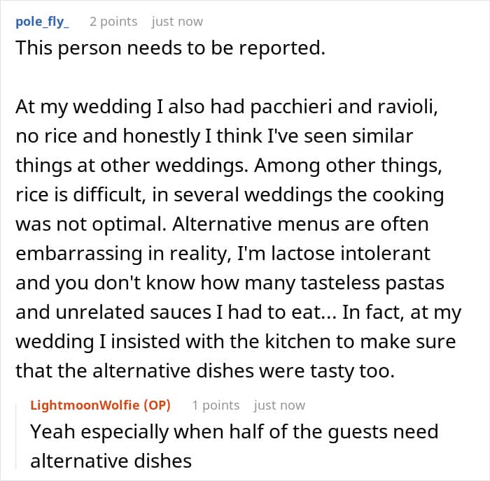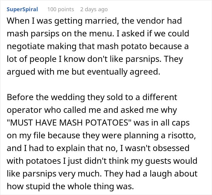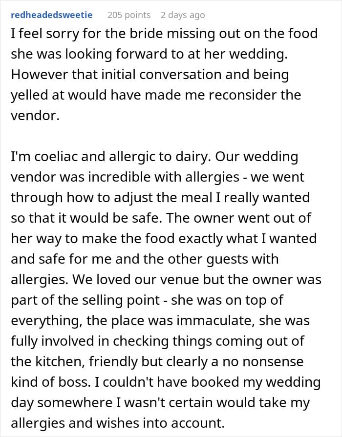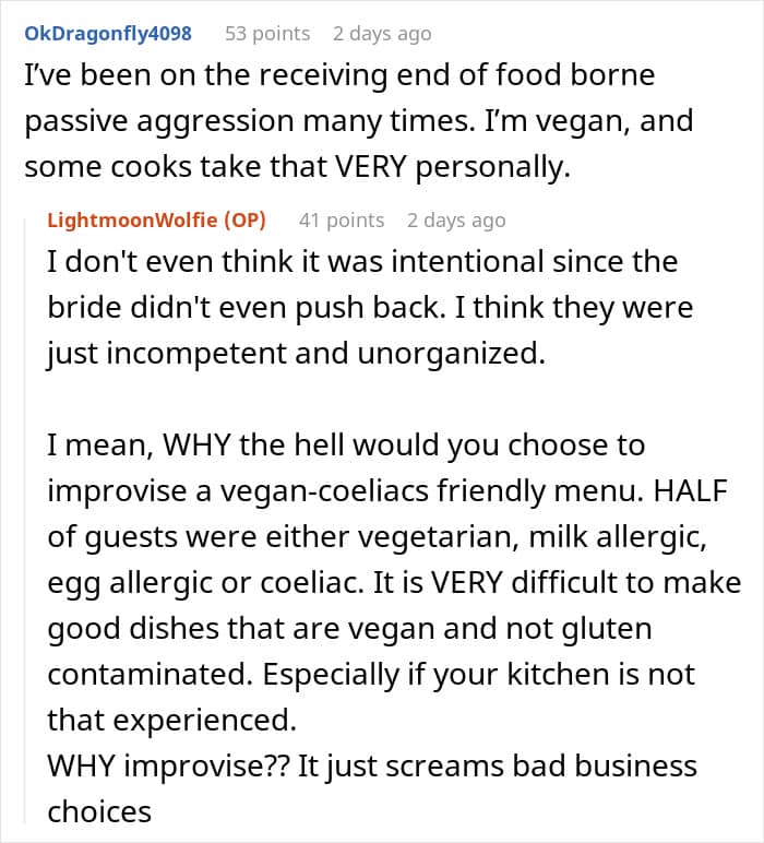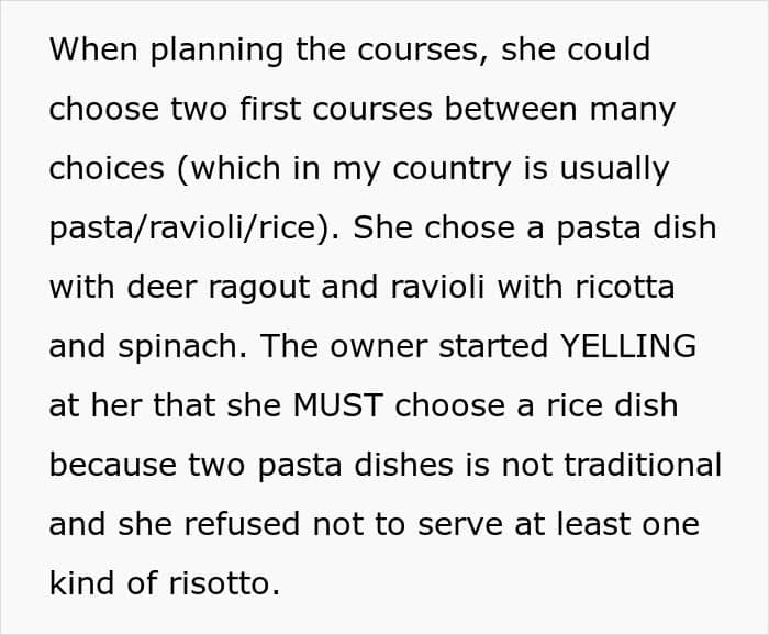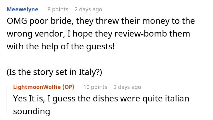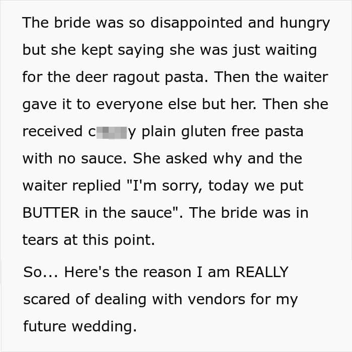 The woman continued to share that the bride was annoyed at the fact that she wasn’t served the dishes she tried during the tasting dinner because they randomly changed the recipe. “She was let down on a promise,” the redditor said.