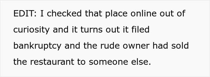 According to the OP—the fiancée of the bride’s brother—they did consider other restaurants; however, they were out of their budget. “The location they chose was also not far from the courthouse and had a lovely garden. The food was good, put aside the rudeness of the owner,” she told We in a recent interview.
