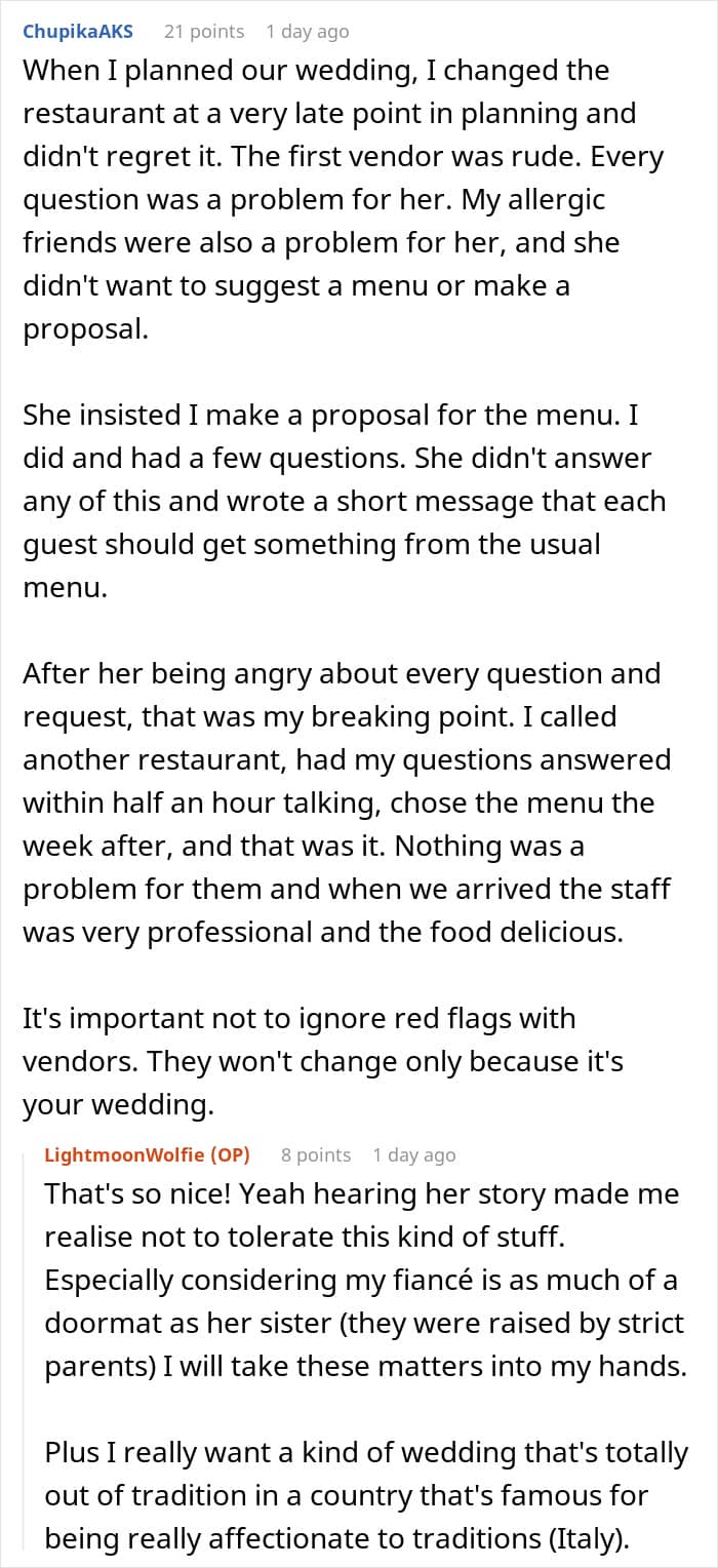 An engaged woman herself, the OP told We that the situation her loved ones found themselves in during their big day was, in a way, a lesson for her. “It made me understand that I need to look for these kinds of red flags. Because a vendor acting like that, trying to make decisions in my place or criticizing my choices, is not going to make my day as I want. I need to choose vendors that like my vision and are enthusiastic to do stuff in a less traditional way,” she shared.