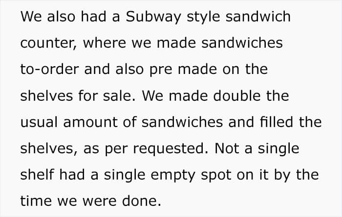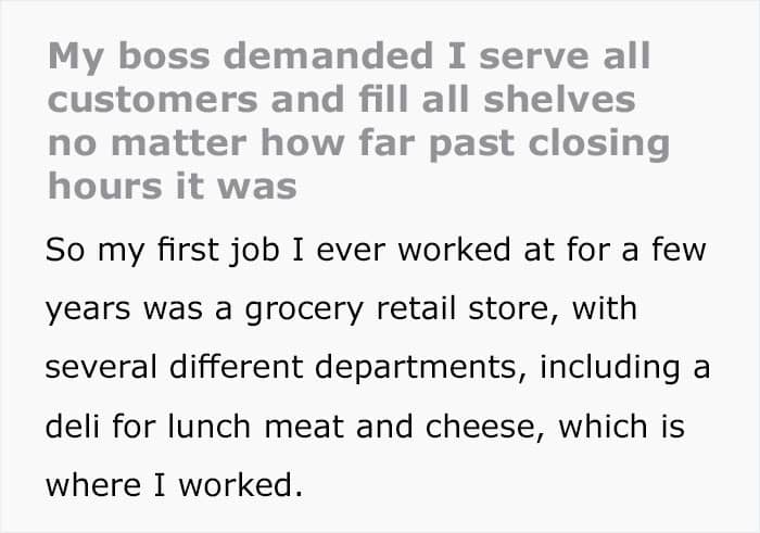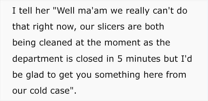 Seeing no other option but to oblige to management’s contradicting demands, the author of the story got to work and did what he was told. Did that satisfy his superiors? No. But some good ol’ malicious compliance made sure that from there on out, this deli will make some exceptions when serving late customers.