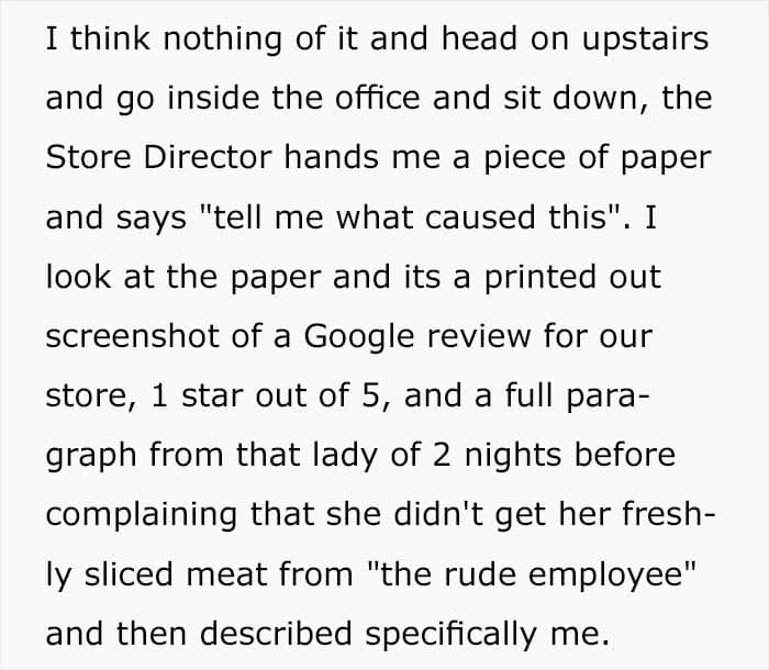 As deli worker u/SpoodsMcBeef tells in his riveting story, the whole mess began after a very late customer demanded to be served right before closing. Having been following his strict sanitization and overtime protocols, the employee politely refused. As a natural chain of events, this being the 21st century, a negative Google review and the manager’s outrage followed.