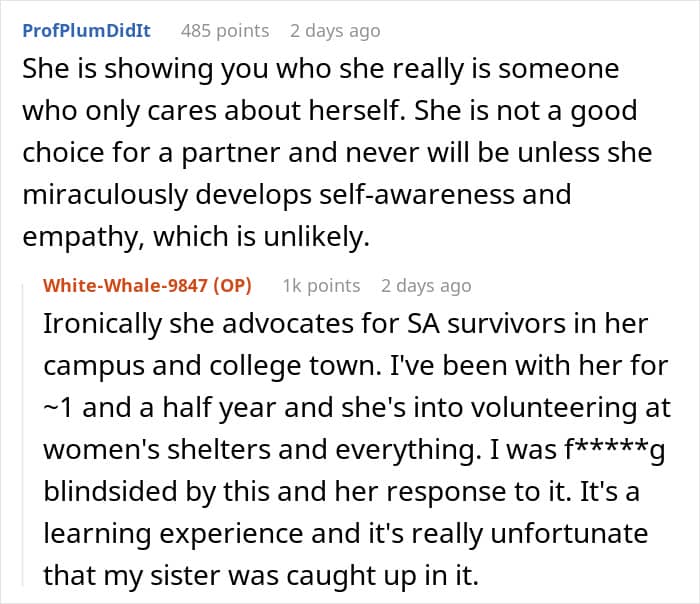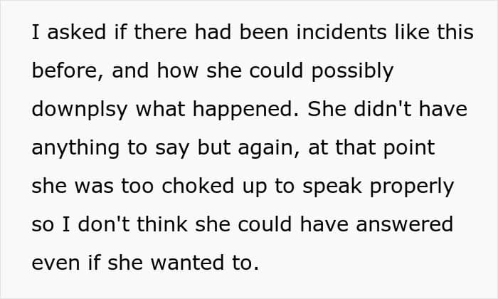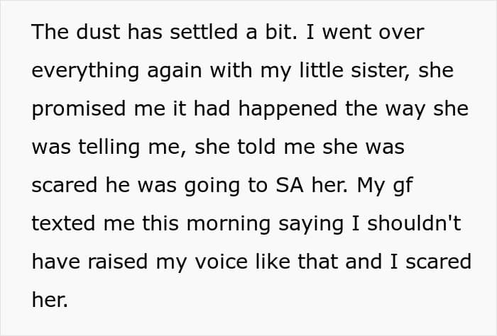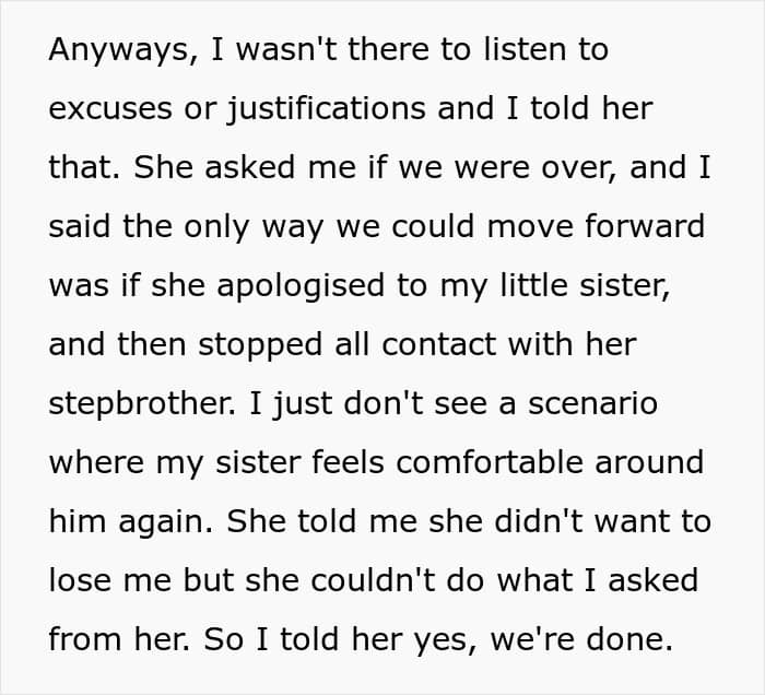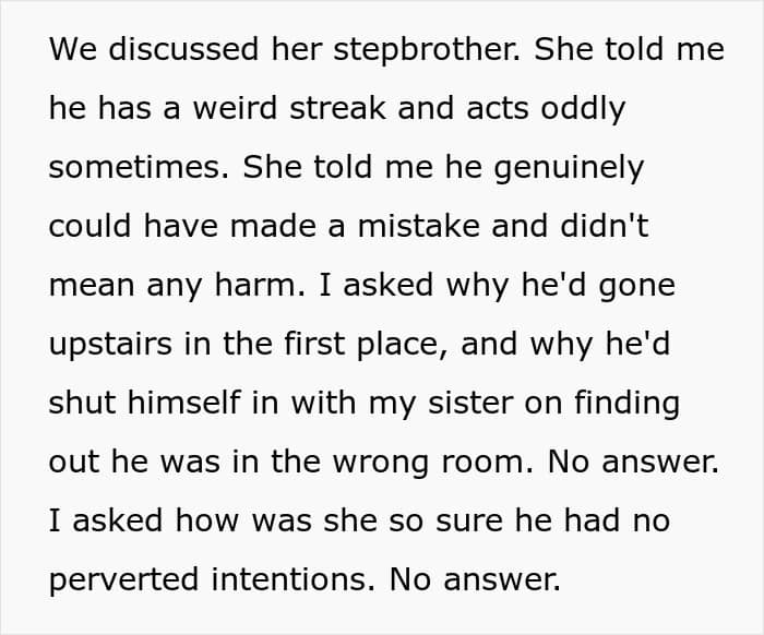 The girlfriend in this story tried to downplay the seriousness of the situation by claiming that this wasn’t a big deal. In her eyes, there was no “hard proof” and her stepbrother “ended up doing nothing.” What’s more, she didn’t take her boyfriend’s opinion seriously and tried to deflect the issue and make it about her feelings.