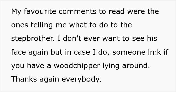 Or, at least, that’s what the author himself wrote in his update. He believes that the report will probably go nowhere, as the only evidence in the story is word of mouth. Still, he thinks that if the stepbrother ever tries anything like this again, there will be an official record of his past behavior.