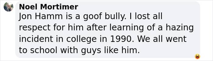 “Jon Hamm is a goof bully. I lost all respect for him after learning of a hazing incident in college in 1990. We all went to school with guys like him,” another said.