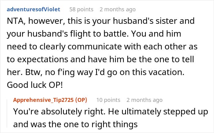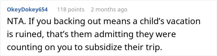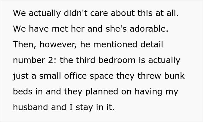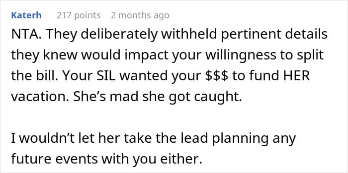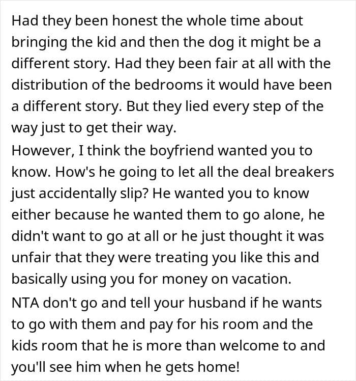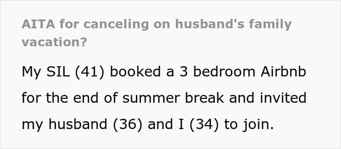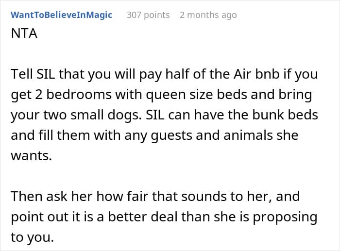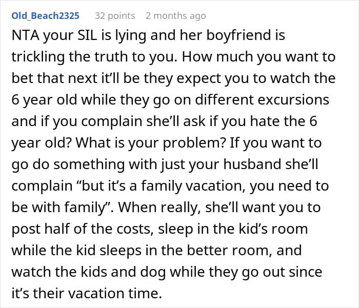 This couple, for example, got a surprise from their SIL about accommodation. They had to cover half the cost for three rooms, but sleep in a tiny one with bunk beds. After finding out their six-year-old niece would be sleeping in a queen bedroom, the pair started wondering if they would be jerks to cancel the trip.