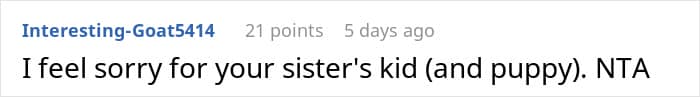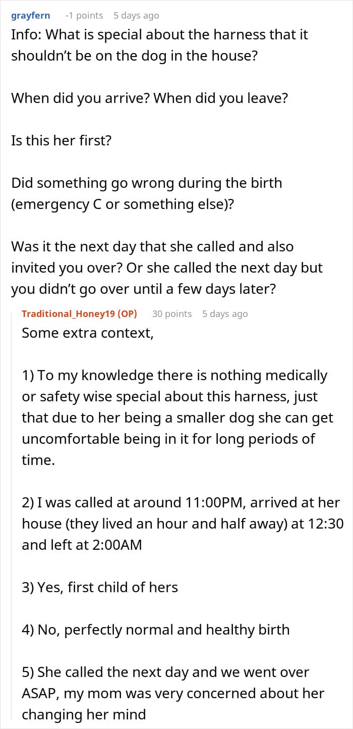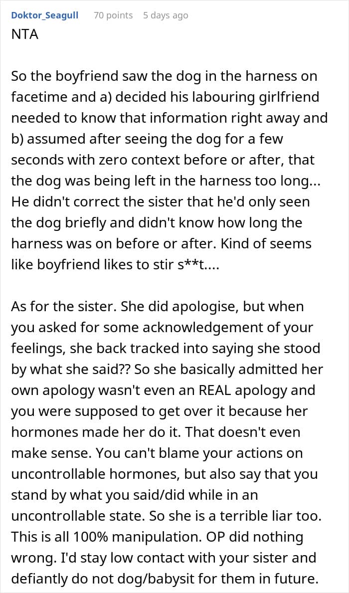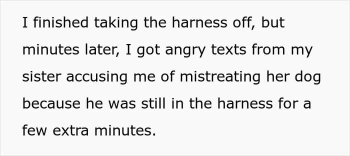 The catalyst for the fight between sisters seems to be that the author didn’t take care of the puppy properly; she didn’t remove the dog’s harness after they got back home from a walk. As she noted in one comment, “There is nothing medically or safety-wise special about this harness, just that due to her being a smaller dog she can get uncomfortable being in it for long periods of time.”