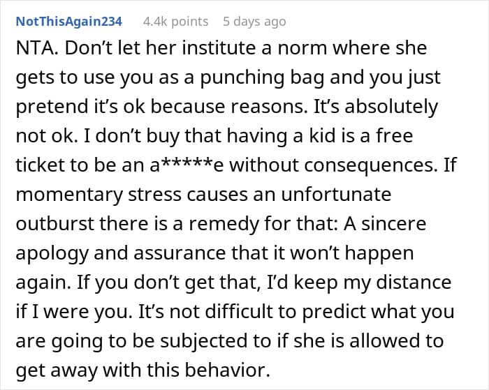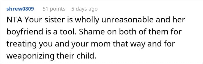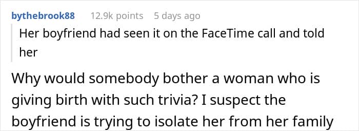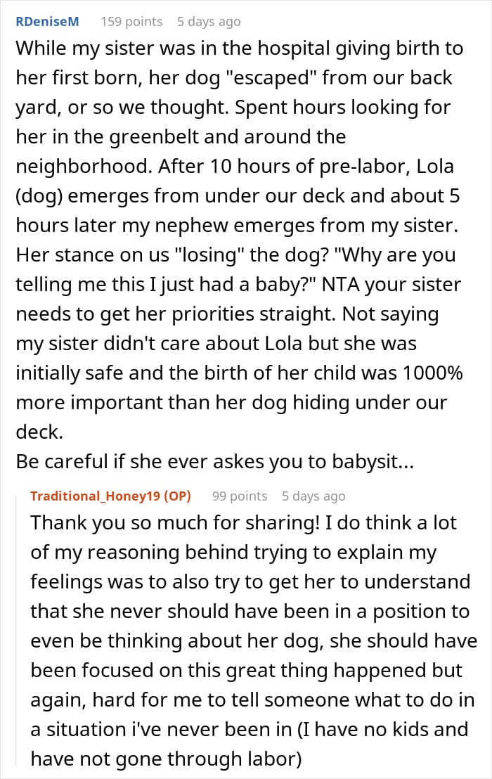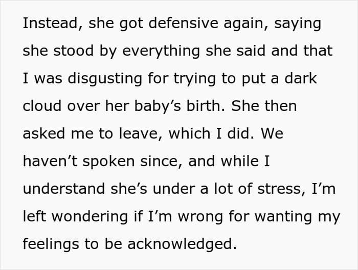 The author was ready to chalk it up to labor hormones and forgive her sister. But when she brought up her hurt feelings after the birth, she was again met with anger and threats she wouldn’t be allowed to see the baby. So, she asked people online: was she wrong to want her feelings acknowledged?