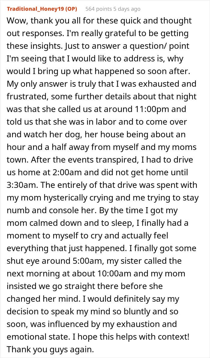 The author clarified why she brought up her issues to the sister so soon after the birth