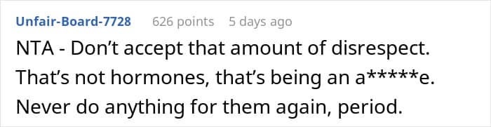 Most people believed the author was not at fault here, as hormones don’t explain such rude behavior
