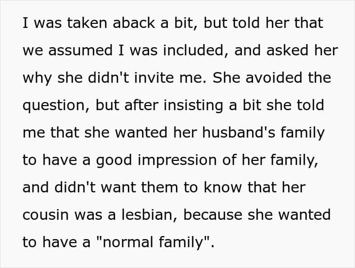 The OP has two hypotheses regarding why her cousin decided to exclude her from the wedding. The first one is that she always felt uncomfortable with the OP’s sexual orientation to some degree.