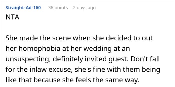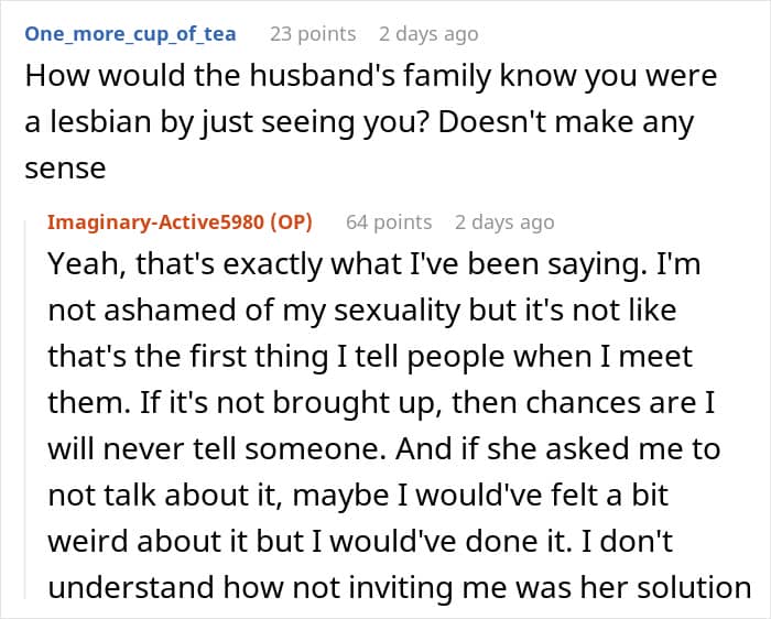 “If you strongly disagree with someone’s view, and if you truly care about your family member, the right thing to do would’ve been [to] stand up for me, and not exclude me to please her husband and his family,” the OP believes.