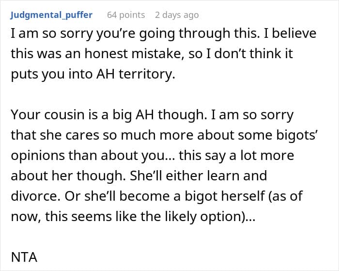 In her original post, u/Imaginary-Active5980 writes how she and her siblings were close with the cousin as kids. “Honestly, I’ve always seen her as another one of my siblings,” the Redditor told We. “She’s an only child and we lived 15 minutes away when we were younger, so we spent all of our time together.”