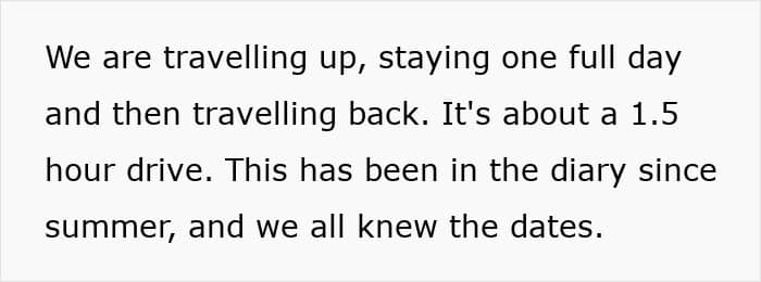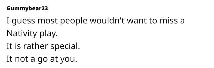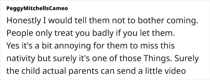 She “unintentionally” double-booked the trip with her grandson’s nativity play, despite knowing the trip dates for months. Her fabulous solution? Ditching half of the getaway to attend the play and then driving back later that evening. I don’t know about you, but I’d be pretty hurt at this point.