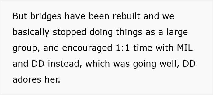 But this favoritism had to boil over at some point, and this happened during a family vacation, which put an end to group holidays. Our OP did encourage her mother-in-law to spend more alone time with her daughter, as the kid really adores her grandma.