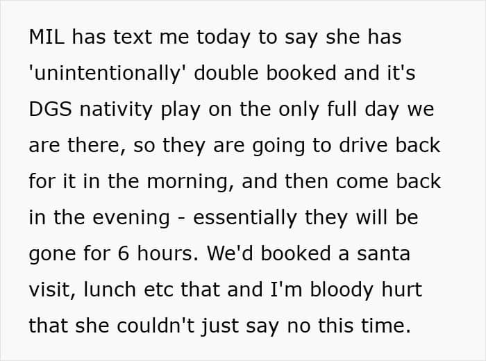 The woman books a family trip, which includes her mother-in-law, but grandma “unintentionally” double-books and ends up choosing her grandson’s nativity play instead