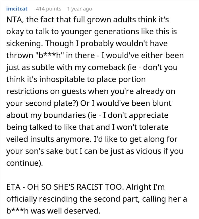 A woman dealt with the rudeness of her boyfriend’s mom during different dinner encounters. She finally snapped one evening after hearing seemingly racist remarks against her. Out of anger, she spoke harshly and disrespectfully toward her supposed future mother-in-law.