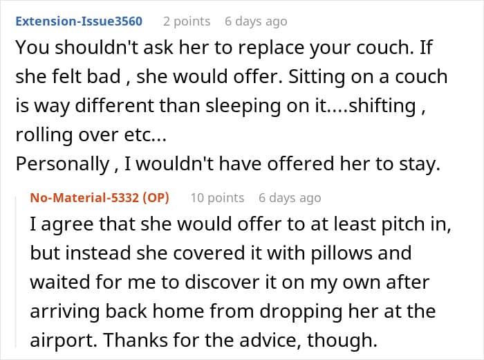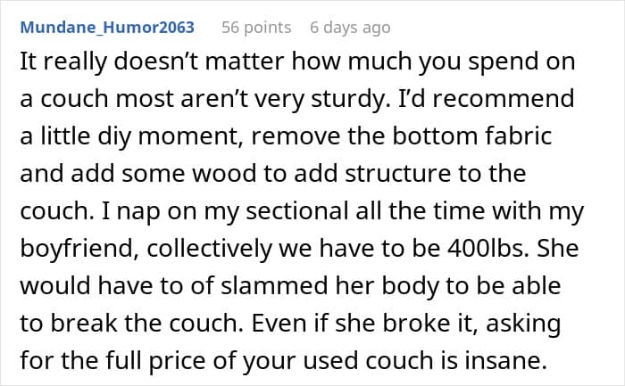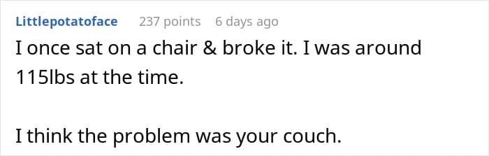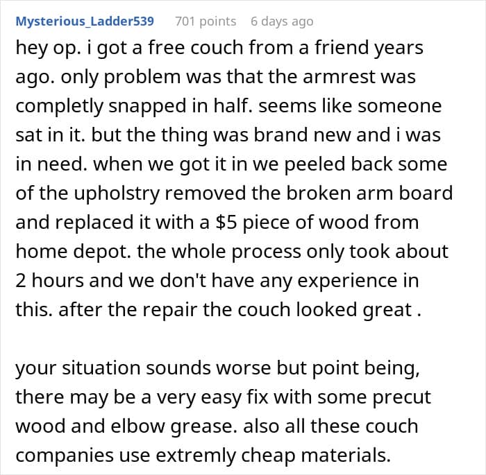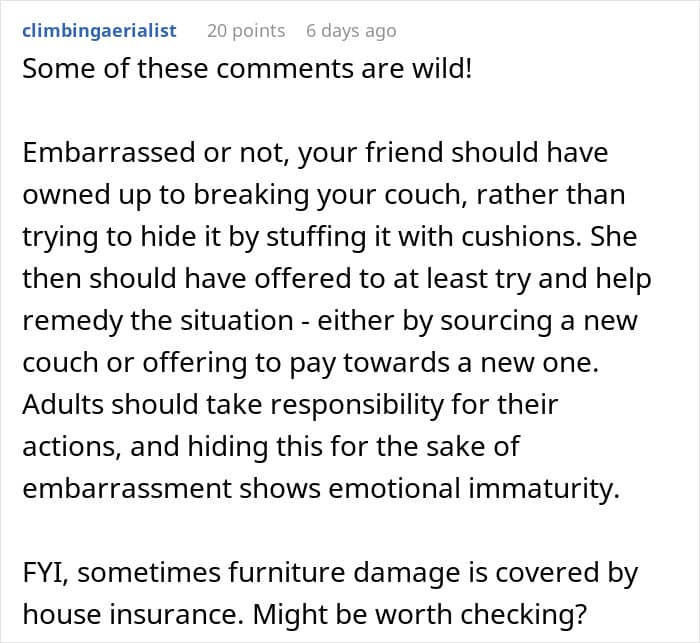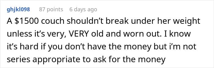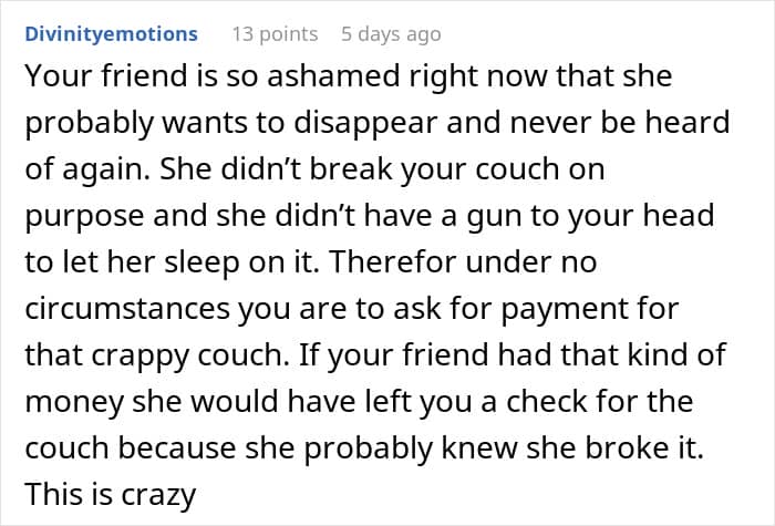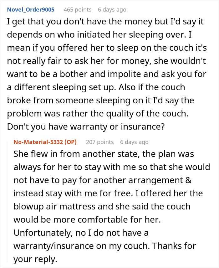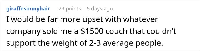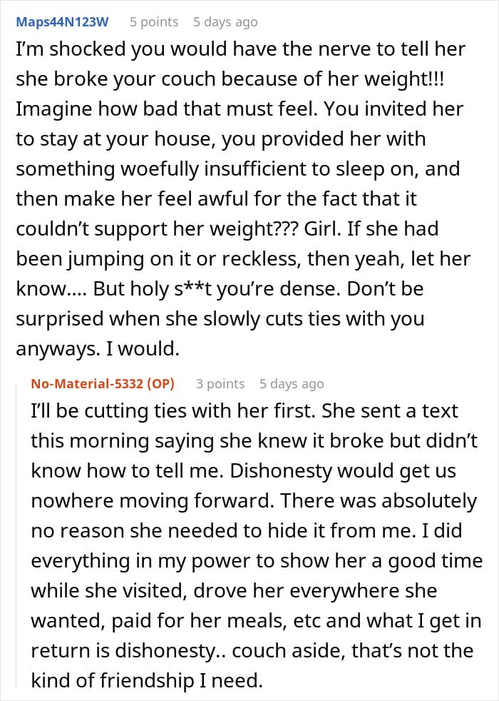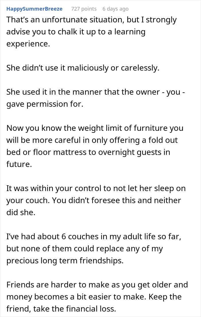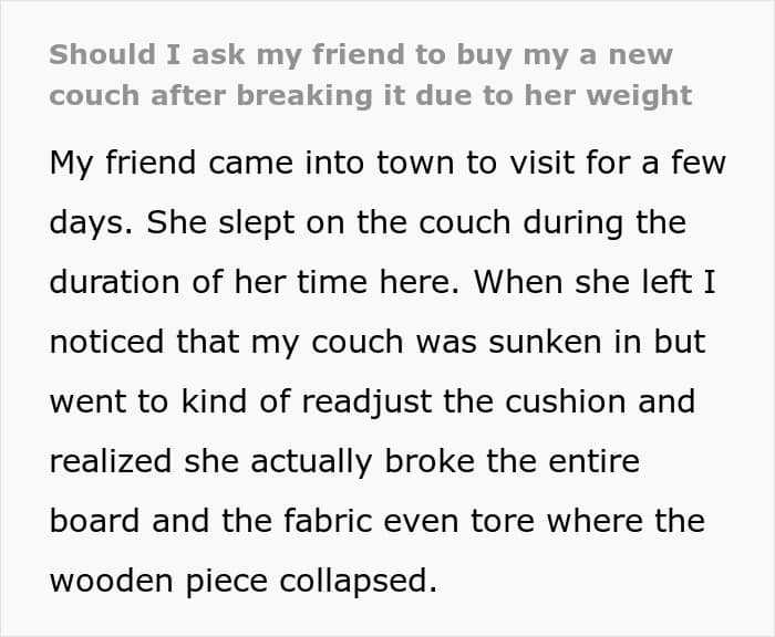 For this Redditor, that choice wasn’t so easy. They recently hosted a friend for a few nights, and everything seemed fine—until after the visit, when they noticed something unusual. The $1,500 couch their guest had slept on was broken. A real pity, to say the least.