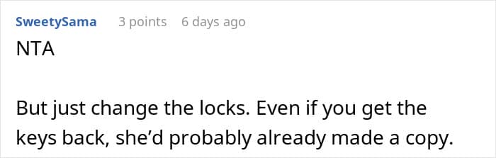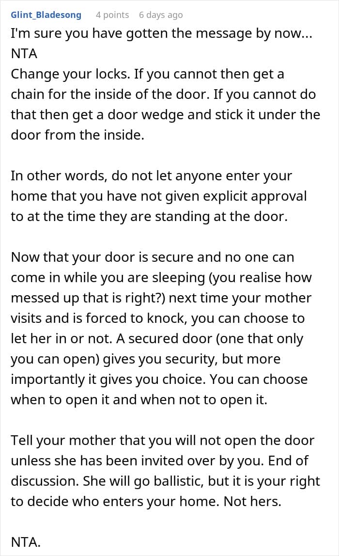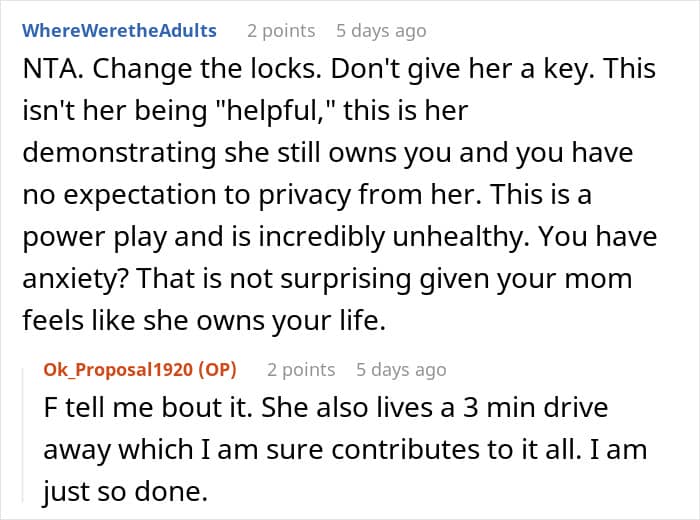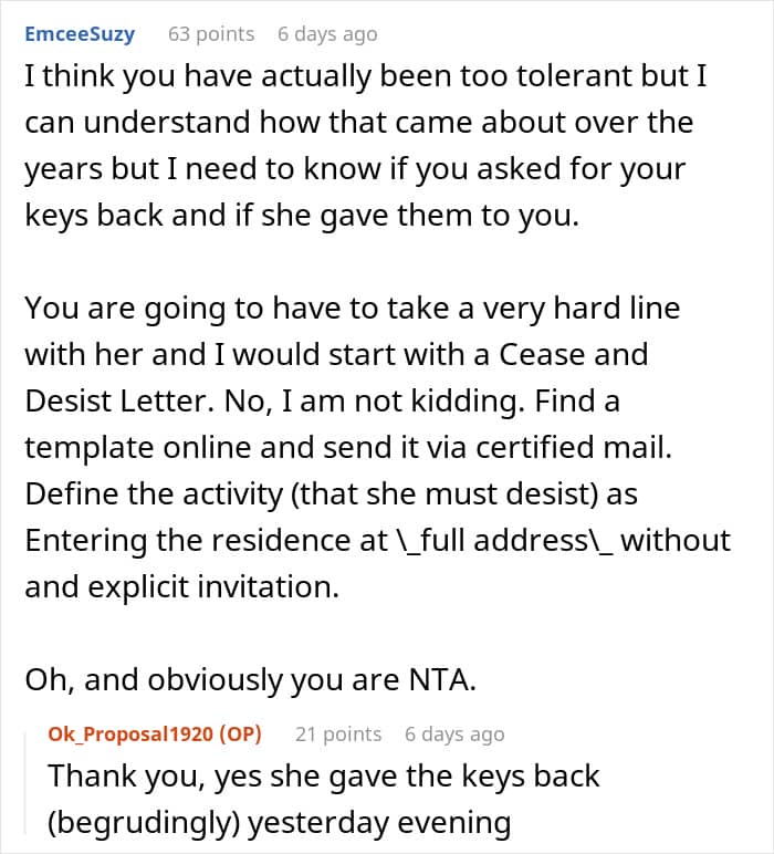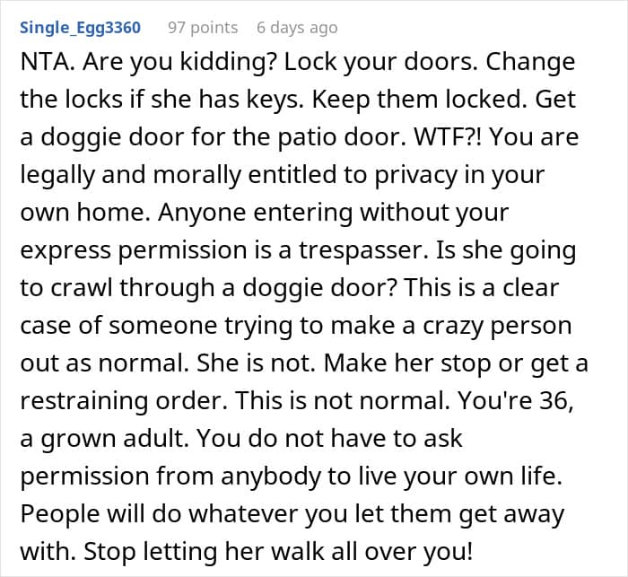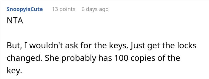 Just like what happened with this 36-year-old woman, whose mom kept letting herself in without any warning. Growing tired of her intrusiveness, she demanded that she get out and even took away the keys to her home, expecting her to never show up there unannounced ever again.