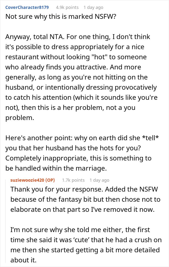 You see, the friend (let’s call her Emma) confessed to Aisha that her husband had been having a little too much fun fantasizing about her. I don’t know about you, but I would have felt very awkward in that situation. But this is not even the best part. Our Redditor recalls how what Emma asked next was a real doozy.