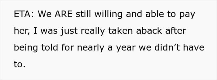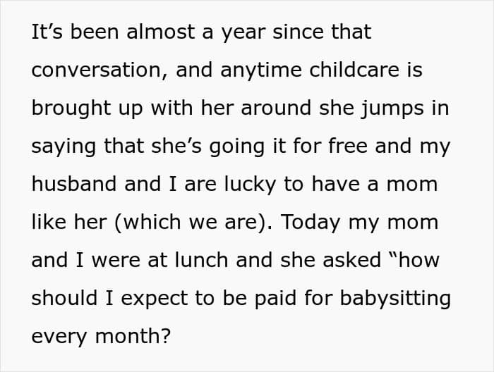 After discussing it with her husband, the couple decided to pay her mom $1000 per month for babysitting, made sure that mom was on the same page and decided that it was time to have a baby. OP’s mom was happy about her future grandchild and emphasized that they don’t need to pay her at all. However, it’s been almost a year since that conversation, and the woman is 7.5 months pregnant.
