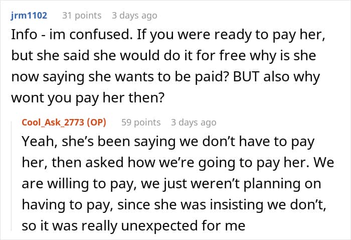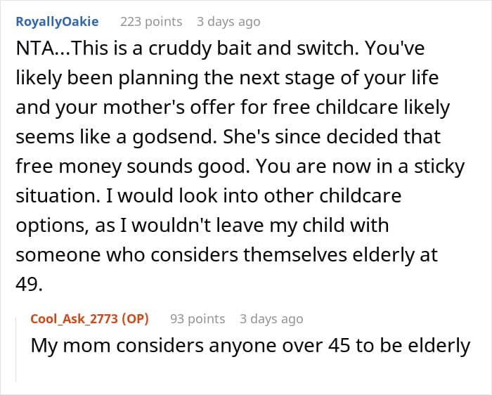 The community members awarded the woman with the ‘Not the A-hole’ badge and agreed that her mom did a bait and switch. “She’s been insisting on not being paid for a year and now this? Talk about a bait and switch. Also, she’s not ‘elderly’!” one user wrote. “Bait and switch isn’t a harsh enough term for this. She manipulated her daughter to get grandkids. I would find alternate childcare personally,” another added.
