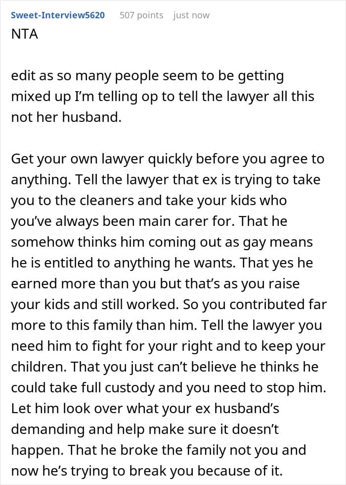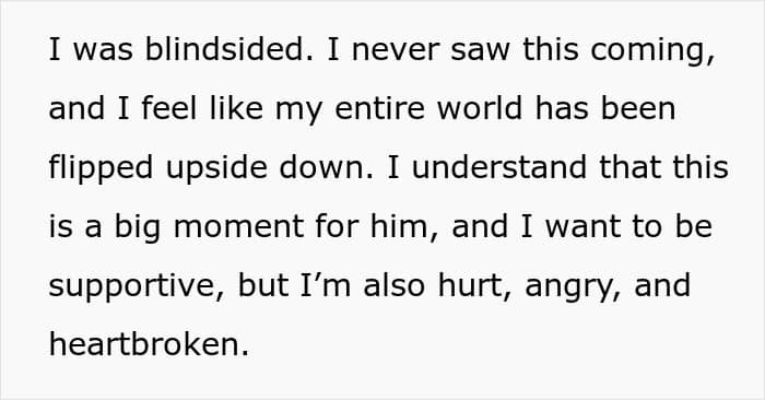 The author of the post is a woman in her 30s whose husband recently came out as gay and demanded a divorce