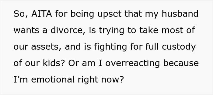 The thing is that the husband was the main breadwinner for the family and, although the author also had her own job, the main contribution to their savings and the house was, accordingly, his. Therefore, the guy claimed that he was filing for full custody over their kids and wanted to take the house as well.