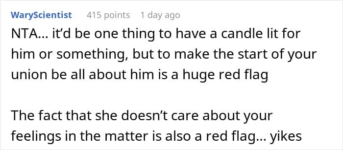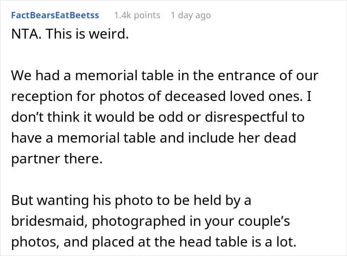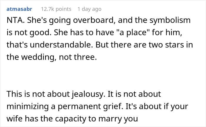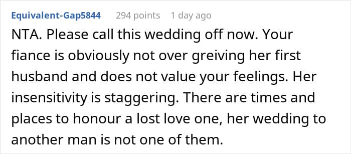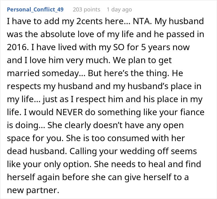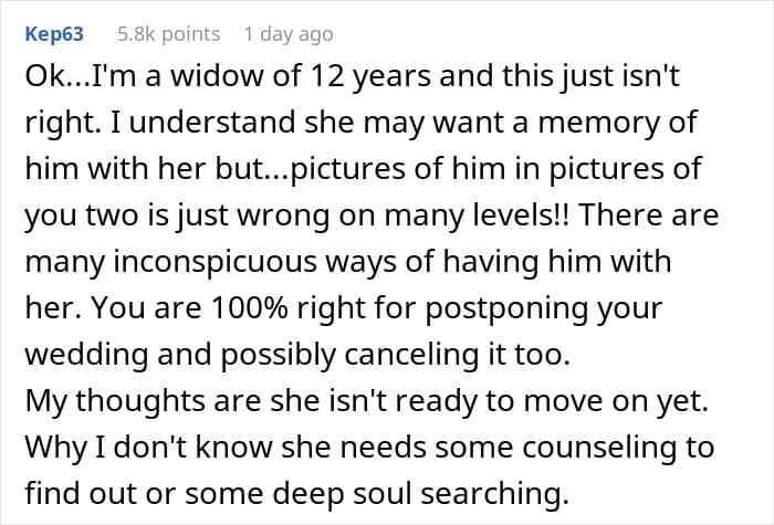 This can make things very painful for their new partners. An anonymous man recently begged the r/AITAH online community for advice. He opened up about how he decided to postpone his wedding after his fiancée demanded to have her late husband’s photo everywhere at the ceremony and reception. Scroll down for the story and how the internet suggested navigating this emotional minefield.