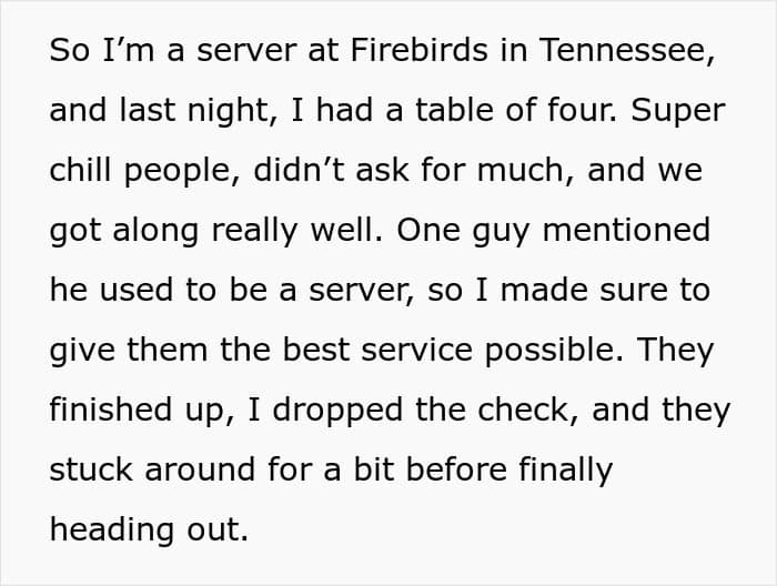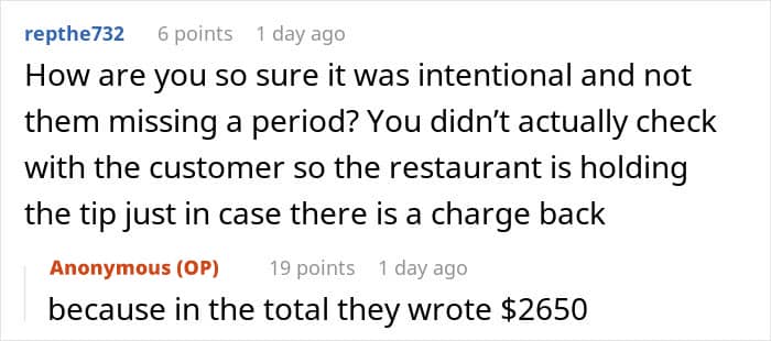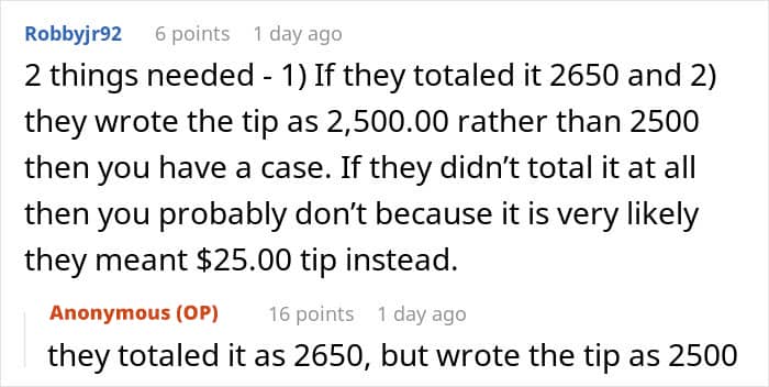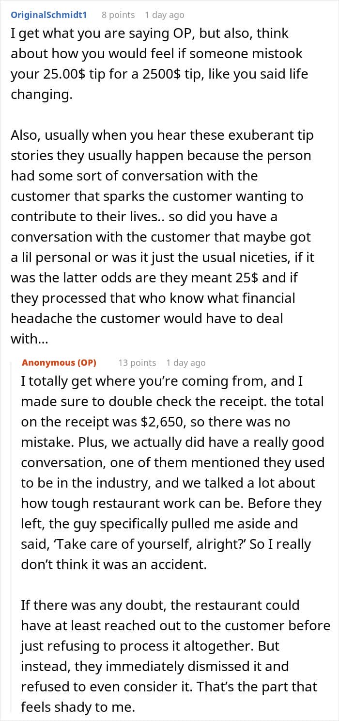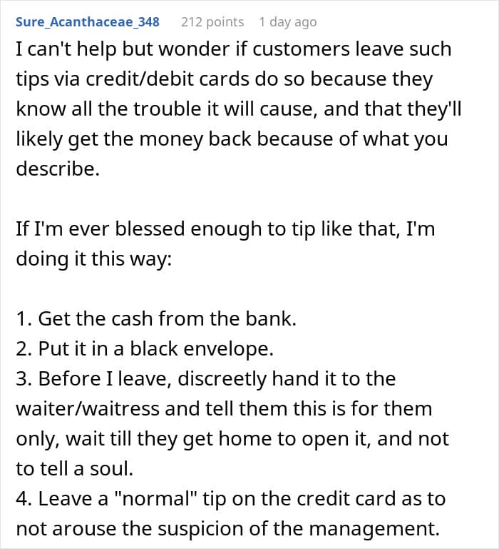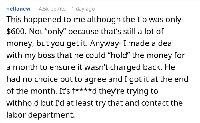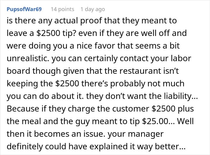 But his happiness was short-lived… When the server showed his manager the bill, they swiftly said the employee would not be receiving the tip. Instead, the restaurant would be “voiding” the transaction so that they weren’t hit with any unexpected hefty chargebacks. The shocked server believes he’s been robbed and is now seeking advice.
