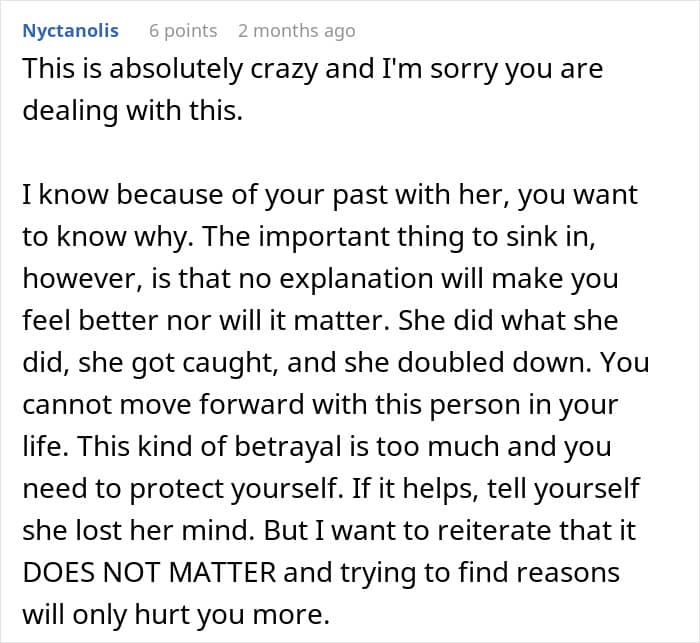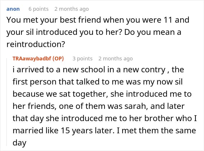 Even after the author went no-contact with her former BFF, she still tried reaching out. “Sarah did try to contact me and her mom put her on speaker once, and I told them both that what she did was horrible, that it could have destroyed my life, and that even if the reasons were different I still couldn’t trust Sarah ever again,” u/TRAawaybadbf told We.