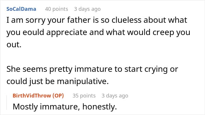 However, her refusal of the gift made her dad’s girlfriend—the one who had arranged the surprise—emotional, and the lady quickly became defensive, further escalating the tension.