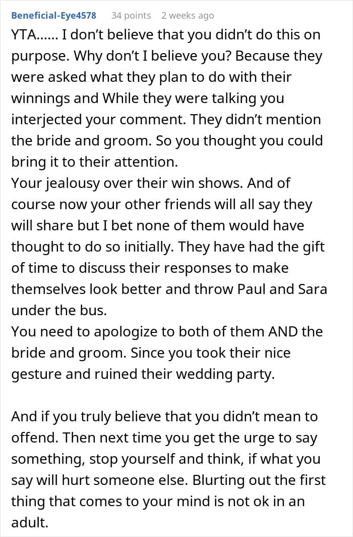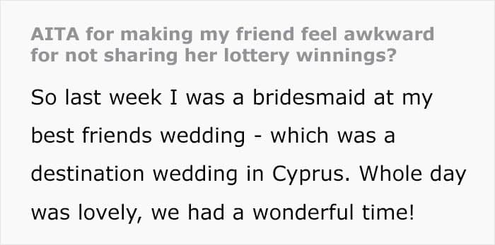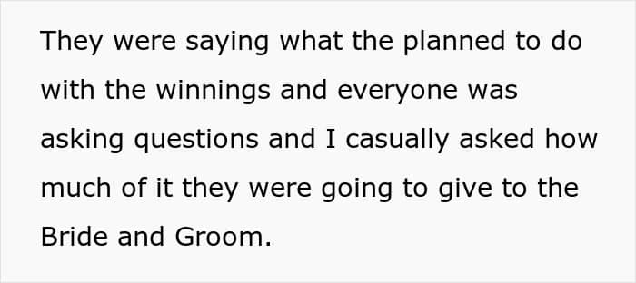 When a friend won the lottery at a destination wedding, this redditor asked how much of the money the winner will give to the newlyweds
