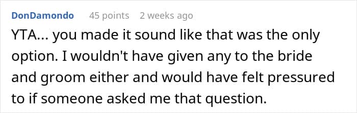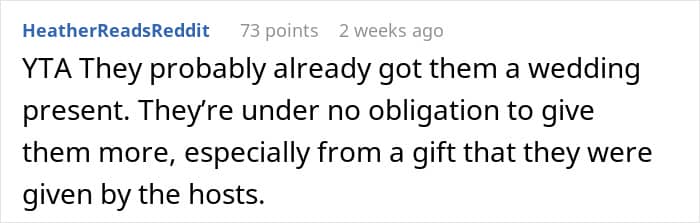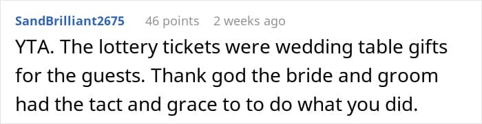 The redditor u/Feisty-Put2529 said that’s what she would do when her friend Sarah won the lottery while at a destination wedding. She got the ticket as a wedding favor, which is why the OP asked how much of the winnings Sarah was going to give to the happy couple—a question that was not well-received by most.