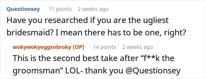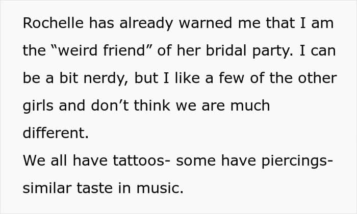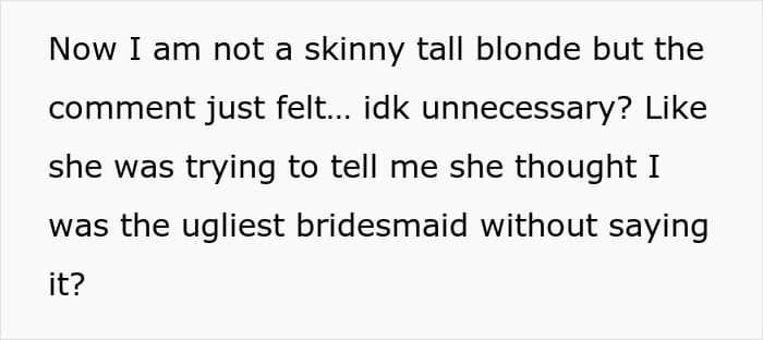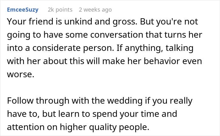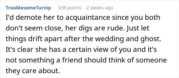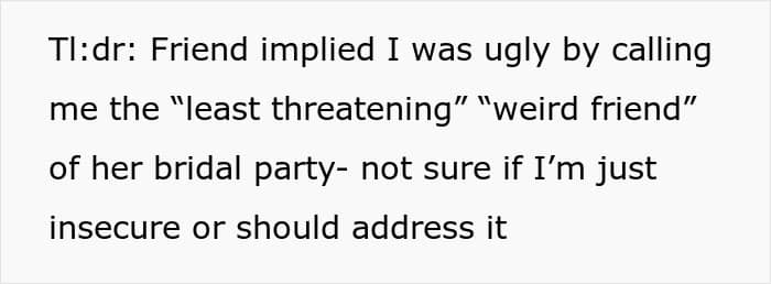 Well, this Redditor’s “best friend” and bride-to-be doesn’t seem to fit that definition. While she invited her to be a bridesmaid for her wedding, her actions raised some serious questions. She made a few backhanded comments about her appearance and dismissed the idea of her being maid of honor, claiming she wouldn’t organize things well. Not very best friend-ly of her, if you ask me.