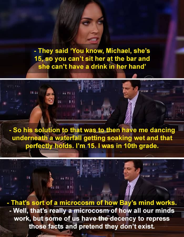 In a 2009 appearance on Jimmy Kimmel Live, Megan Fox recounted that when she was an extra on Bad Boys II, Michael Bay demanded they film a sexualized scene with the actress despite the fact that she was 15 years old at the time.