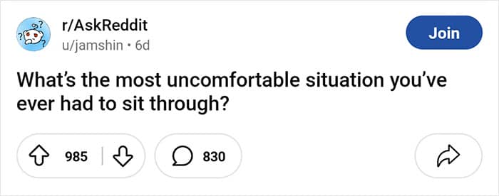 Someone asked “What’s the most uncomfortable situation you’ve ever had to sit through?” and netizens detailed the worst experiences they went through. So get comfortable as you read through, brace yourself for the second-hand cringe and be sure to share your own stories below.