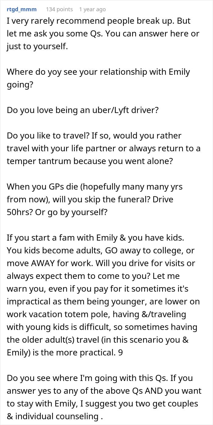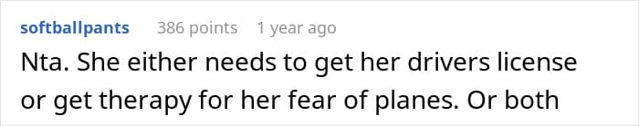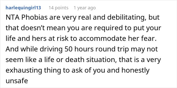 That’s what this Reddit user dealt with when she had to adjust her travel plans because her girlfriend feared flying. Traveling 50 hours back and forth by car was the next option, but she would need to drive the entire time because her significant other did not have a license.