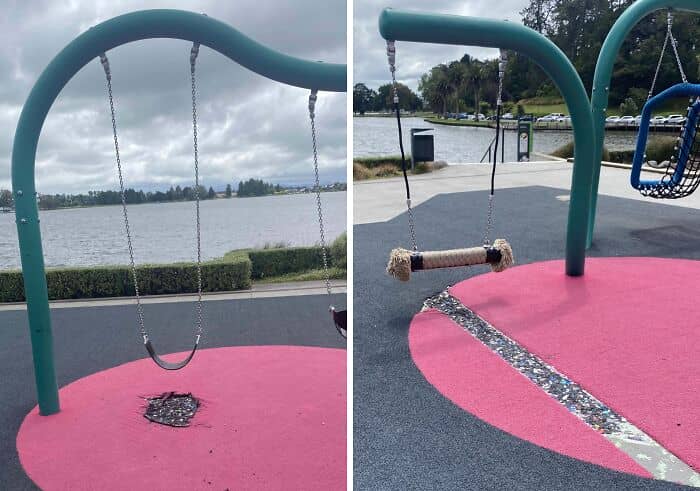 Why are we using plastic turf? It heats up to really high temperatures in the sun (especially dark colours like BLACK), it gives horrendous carpet burns, and it can’t be repaired. What happened to wood chips?