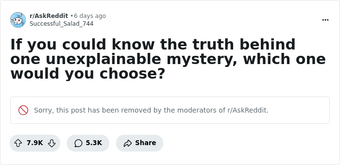 Someone asked “if you could know the truth behind one unexplainable mystery, which one would you choose?” and people described what they would love to know. So get comfortable as you scroll through, upvote the ones you also find engaging and be sure to share your own examples in the comments below.