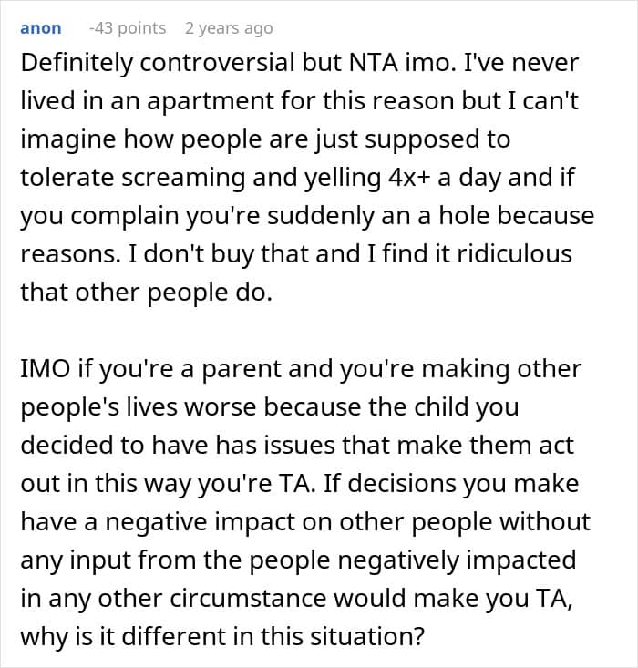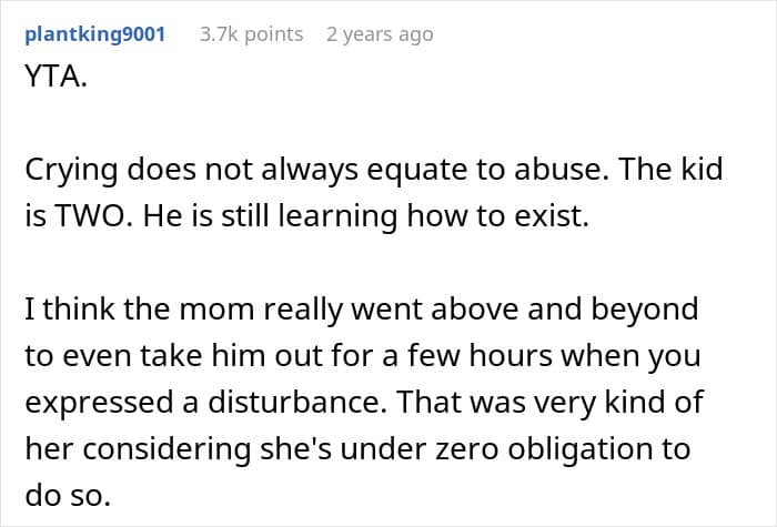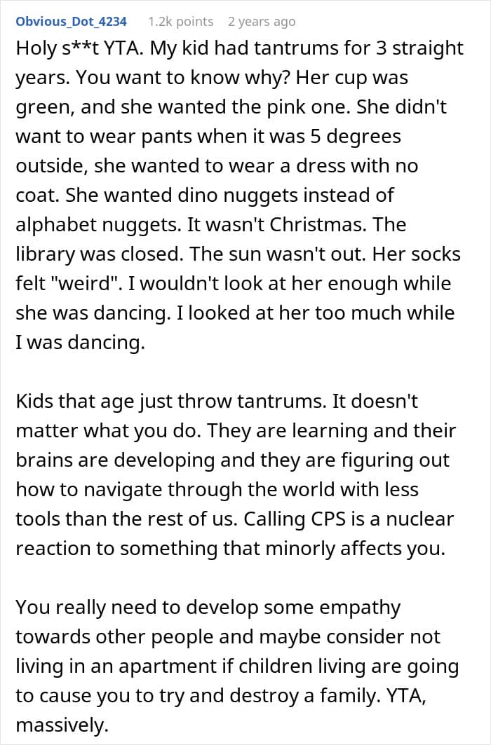 “Whilst parents can comfort and distract the child, they are not magicians and cannot stop tantrums nor should they want to,” Vicki Broadbent, author of The Working Mom: Your Guide to Surviving and Thriving at Work and at Home, said. “Tantrums communicate pain or frustration at being unable to do something, hunger, thirst, and overtiredness, so we as parents can respond to their cues. The neighbor should wear noise-cancelling headphones or consider moving to a remote island where birds, animals, and humans won’t bother her! Not sure where that is though!”
