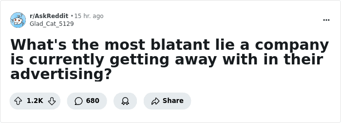 Many people catch this deception. When Reddit user Glad_Cat_5129 asked, “What’s the most blatant lie a company is currently getting away with in their advertising?” folks gushed with answers. We compiled the best ones for you to peruse, so just scroll through!