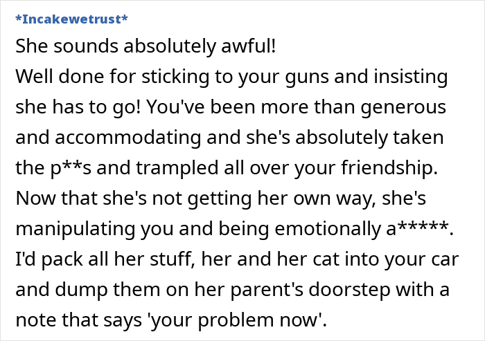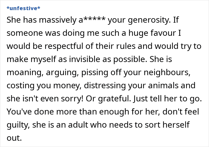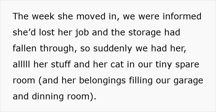 However, there have to be some limits, this houseguest seemed to have ground her life to a halt. It can be hard to pick yourself out of a slump, but, arguably, she had it better than most. She was not homeless and got to keep her stuff, her pets and was given time to search for a job. There are landlords who won’t take pets even when you are literally willing to pay for it, so best to not disrespect a forgiving host.