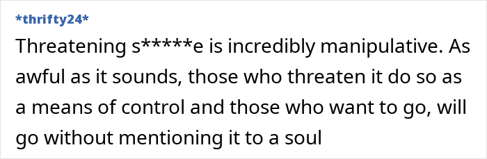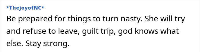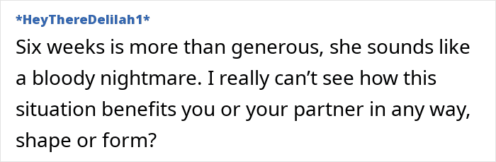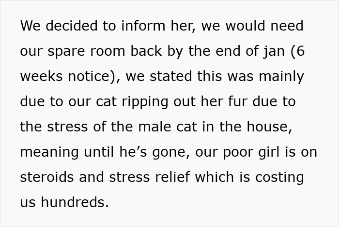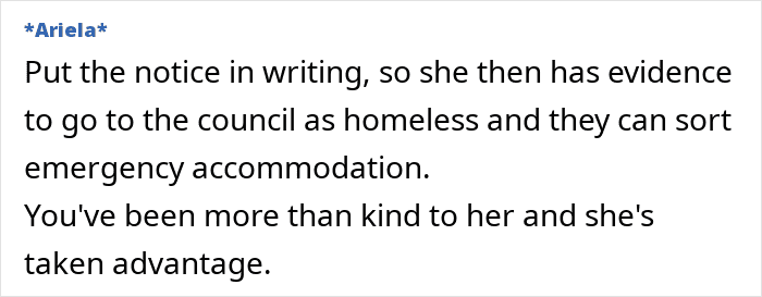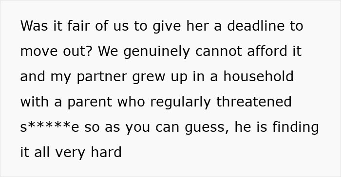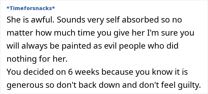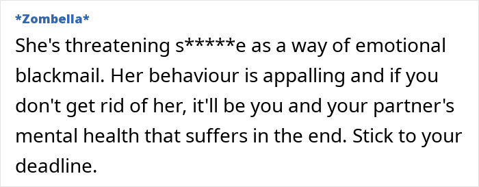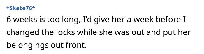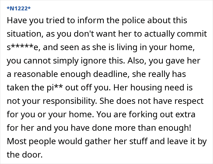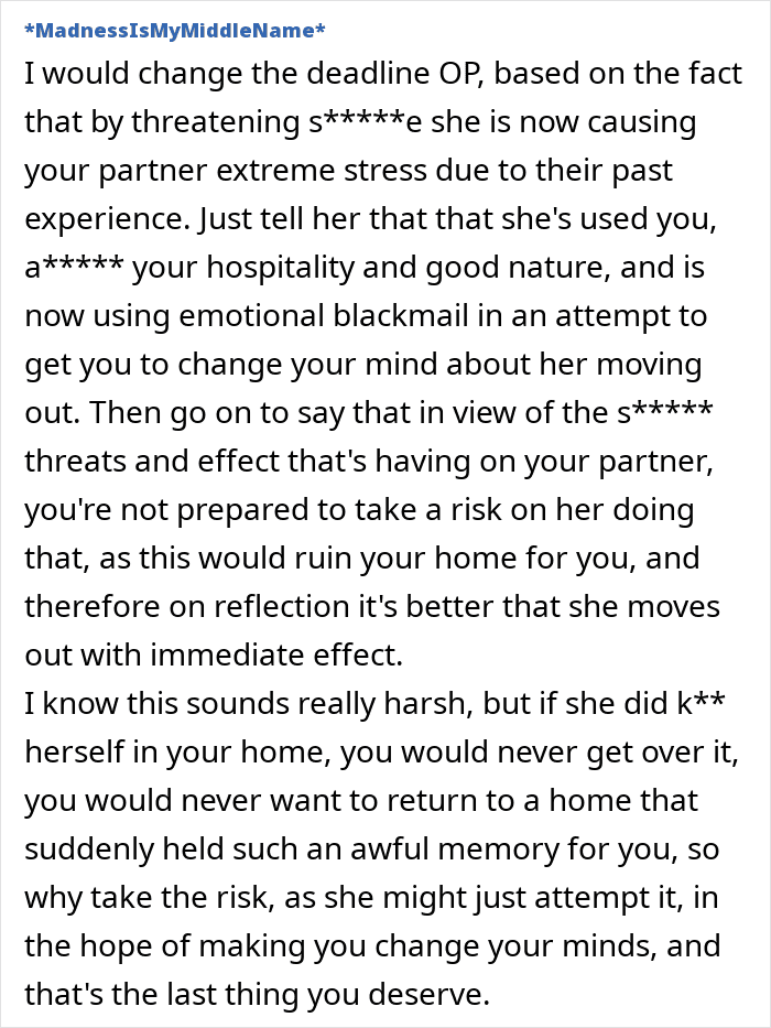 The real “kicker” is her threatening self-harm when given six weeks to move out. This goes beyond unreasonable and is downright manipulative and evil. If one was to do this in a relationship, it would be considered domestic abuse. Doing this to one’s hosts is both shortsighted and really reflects poorly on her.